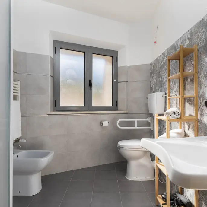 Bilocale al piano terra con doppio accesso privato, rampa e posto auto, giardino. Camera matrimoniale (letto matrimoniale o 2 letti singoli), zona living con divano letto matrimoniale, angolo cottura completamente attrezzato con forno a microonde, tv a schermo piatto. Bagno privato attrezzato per disabili.