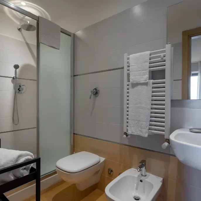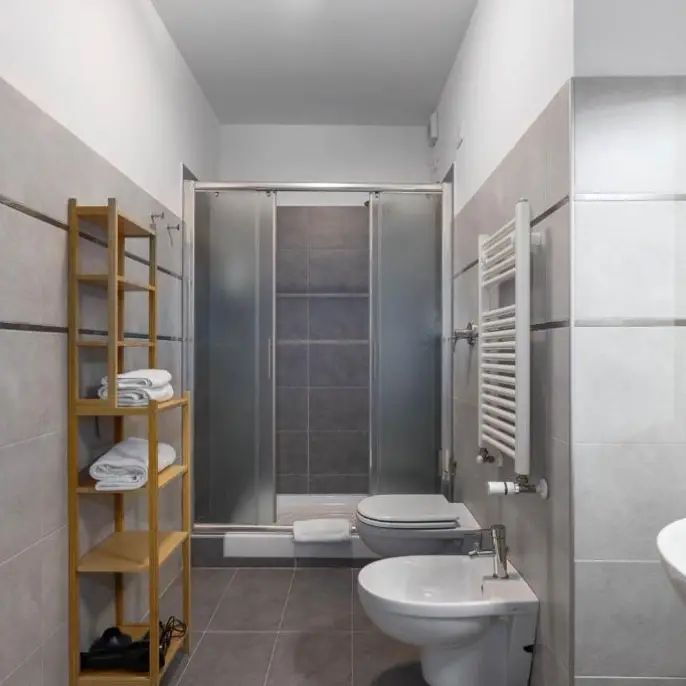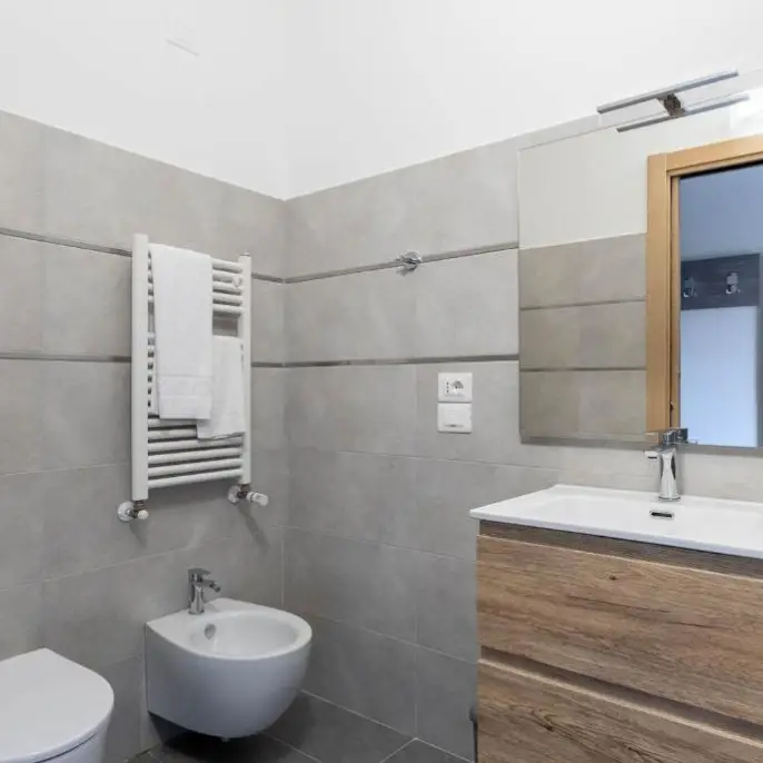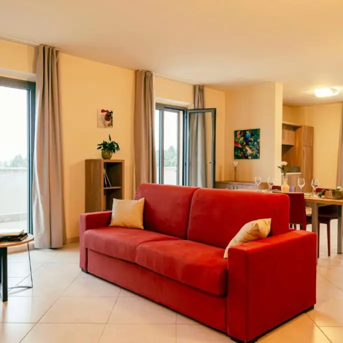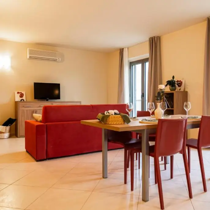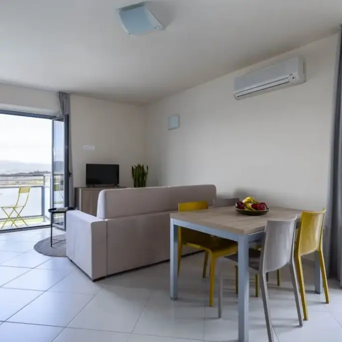 Ampio trilocale con 2 camere matrimoniali (letto matrimoniale o 2 letti singoli), ampia zona living con divano letto matrimoniale, angolo cottura completamente attrezzato con forno a microonde, tv a schermo piatto. Terrazza privata o balconcino con vista. 1 o 2 bagni privati con doccia. Può ospitare fino a 6 persone.