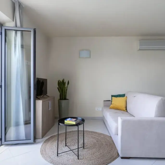 Ampio bilocale con camera matrimoniale (letto matrimoniale o 2 letti singoli), ampia zona living openspace con divano letto matrimoniale, angolo cottura completamente attrezzato con forno a microonde, tv a schermo piatto. Terrazza panoramica. Bagno privato con doccia.